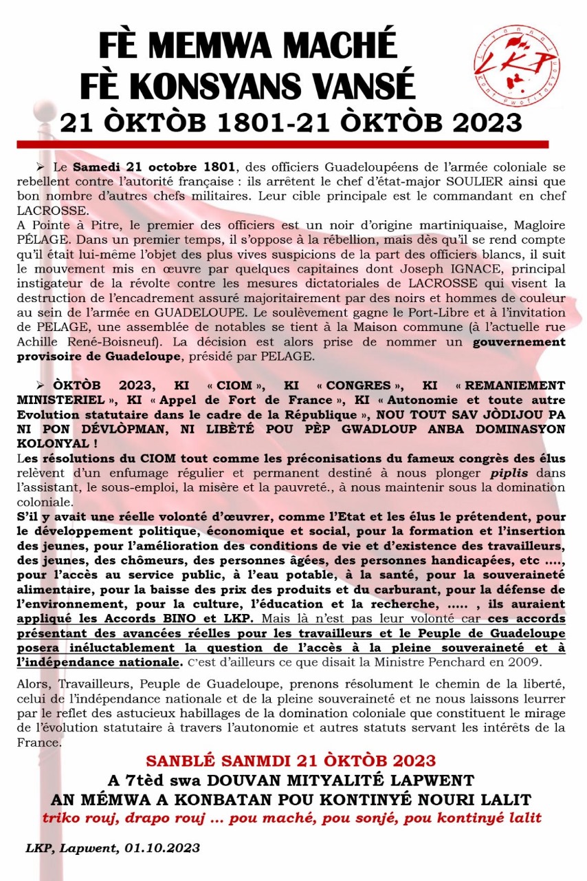 ADN Awa !, 14 février 1952, 14 décembre 2010, 16 décembre 2008, 26 octobre 2010, Accord Bino, Affaire Jephté Depreux, Apartheid, BEO, Campêche, Charles Henri Salin, Chlordécone, Clan Koury, Cliniques KADJI, Collectif 5 Février, Conflit Danone, Dialogue social, Droit du travail, Esclavage, Etats-Généraux, Guerlain, Haïti, Justice coloniale, Kanaky, LKP, Mai 1967, Martinique, Mayotte, Mercury Day, Michel Madassamy, Mwa Mé, Octobre 1801, Pétition anti LKP, Plantation HAYOT, Prix des carburants, Procureur PRETRE, Prud’hommes, Racisme, Représentativité UGTG, SARA, Sarah Aristide, Solidarités, Tourisme, VIH/SIDA, Xénophobie, Pauvreté, Affaire "Patrice (...), Affaire Marc SAINT-HIL, Agriculture, Algérie, Assignation en justice, Capesterre-Belle-e (...), CESER, CGOSH, CHU Lapwent, Collectif de Défense, Collectif des organisa, Construction du nouvea, Contre le Pass sanitai, Défilés, Dlo Gwadloup / Eau de, EFS Gwadloup, Elections 2020, Elections CESR, Elections Chambre (...), Elie DOMOTA, Epidémie Chikungunya, Epidémie CORONAVIRUS, Epidémie CORONVIRUS, Etats-Unis, fidel castro, Fillon / Domota, Grève C.A.S.E kapestè, Grève canal satellite, Grève Carrefour Milénis, Grève carrière de (...), Grève CGSS 2016, Grève CIST, Grève collectivités, Grève Collectvité (...), Grève de la faim Denis, Grève Hôpital Beauperthu, Grève Mairie Baie-Mahau, Grève Mairie Basse-Terr, Grève Pôle emploi (...), Grève Sablière de (...), Grève SIG février (...), Grèves, Grèves collectivités, Gwiyann, Inde, Jacques CHIRAC, Journal Rebelle, Journal Rebelle, Kanaky, Kolèktif Bastè kon (...), L’après cyclone IRMA et, Licenciement(s), Lopital Kapèstè, Louisa HANOUNE, Luc REINETTE, Marie-Galante, Meetings, Mexique, Mouvement social (...), Obligation vaccinale, Palestine, Père Chérubin CELESTE, Procès Elie DOMOTA (...), procès Jocelyn LEBORGNE, Propagande élections, Rapatriement de la, Régionales 2015, Respect des droits, Roland THESAUROS, Saint-Martin, Secteur B.T.P, Secteur Banque-Assuran, Secteur Banques Assura, Secteur Emploi-Formati, Secteur Immobilier, Secteur Nettoyage-Blan, Secteur Sécurité, Secteur Social et (...), Secteur Transport, TCSV/décès camarade (...), Total pwofitan, UEC-UGTG, ULTEA-UGTG, UNASS-UGTG, UTAS-UGTG, UTC-UGTG, UTE-UGTG, UTED-UGTG, UTHTR-UGTG, UTPP-UGTG, UTS-UGTG, UTT-UGTG, Venezuela, Virus ZIKA,